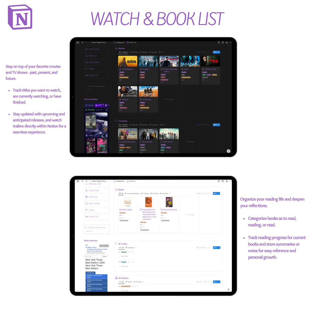 - Watch List: Track movies & shows, view upcoming releases, and watch trailers directly in Notion.