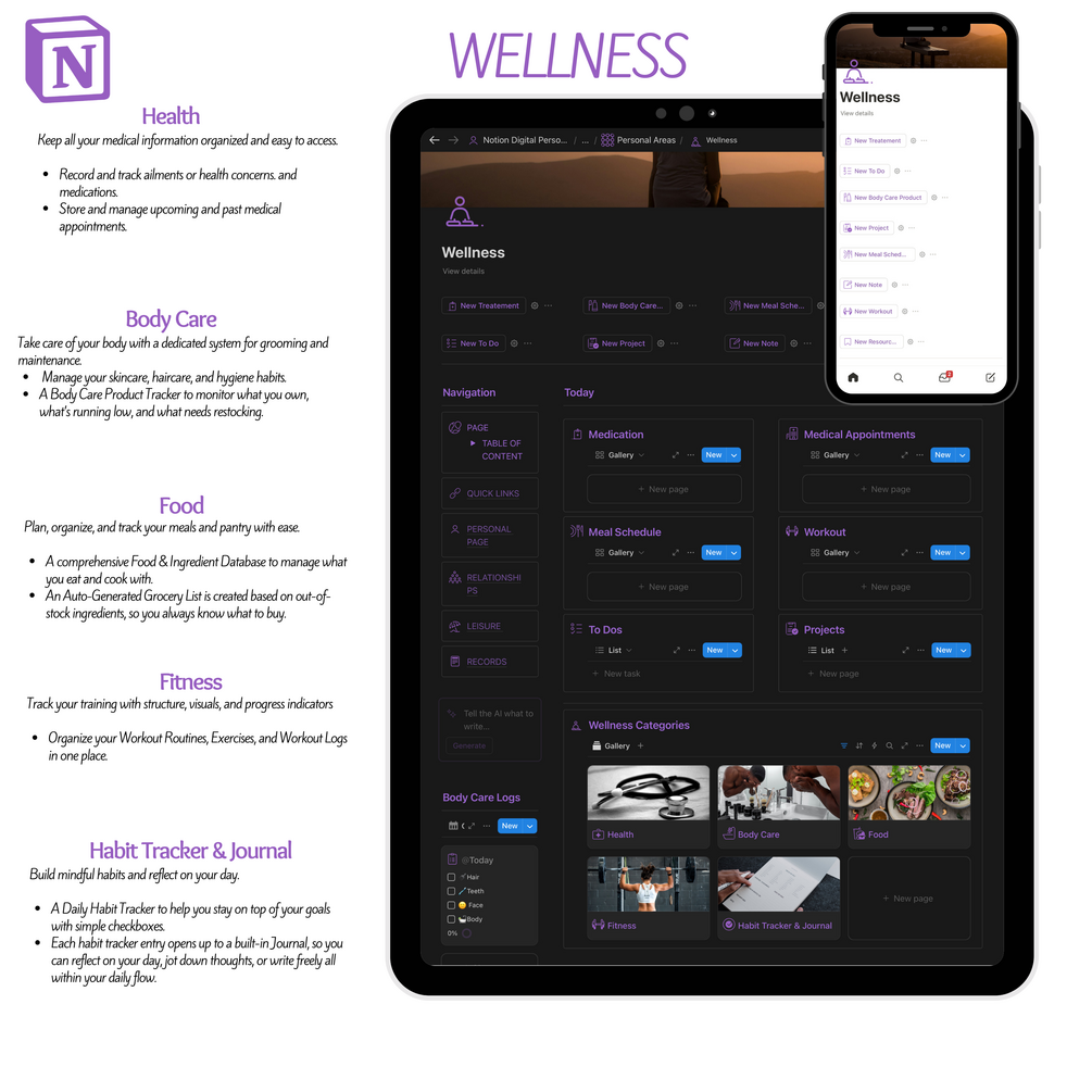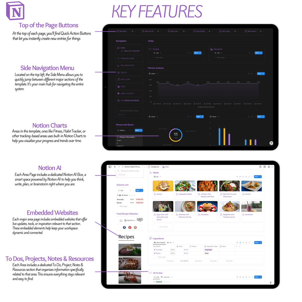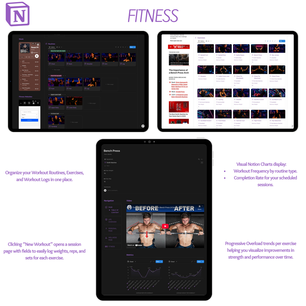 - Integrated Notion Charts for fitness tracking, habits, and goal progress.