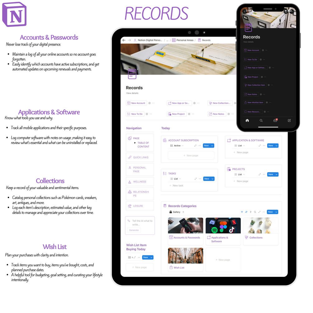 - Apps & Software: Track tools across phone & computer, with purpose and usage notes.