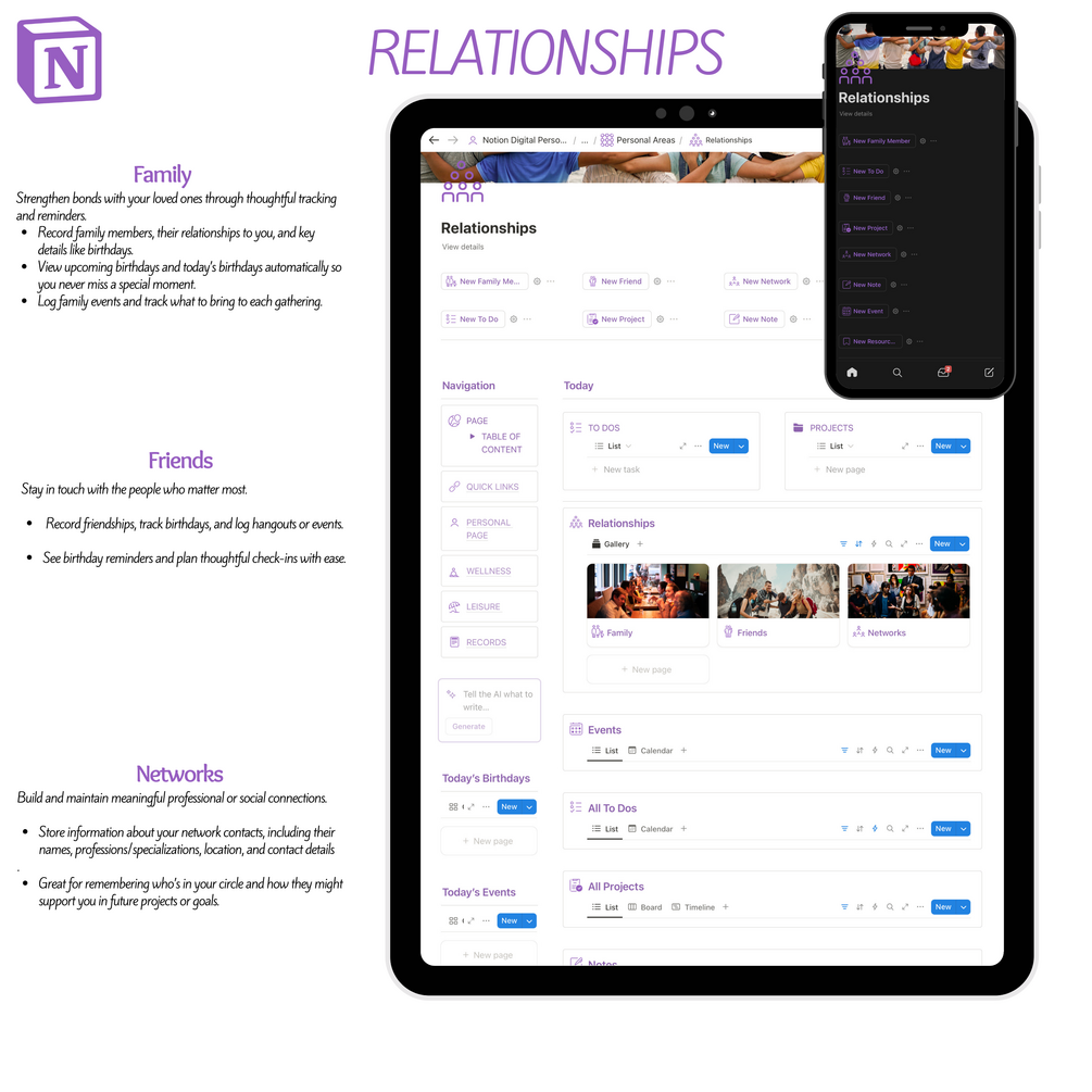 - Family & Friends: Track birthdays, relationships, and upcoming events with reminders.