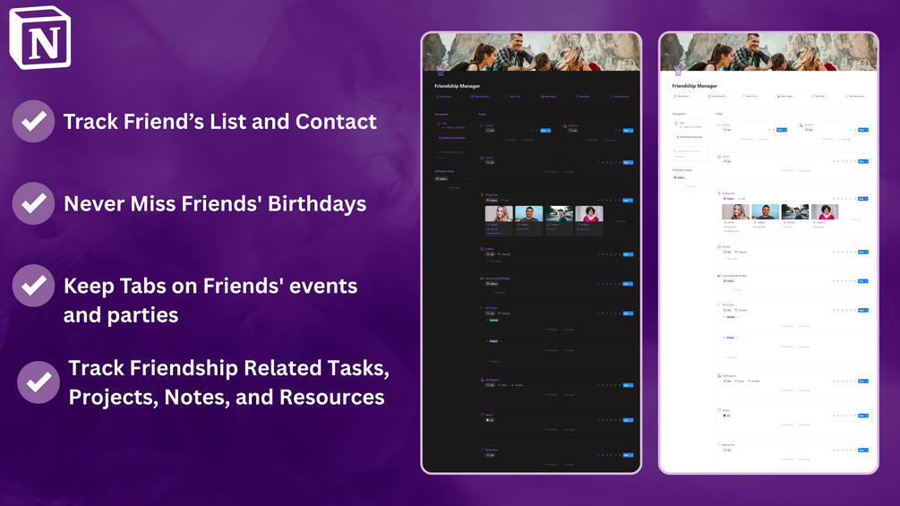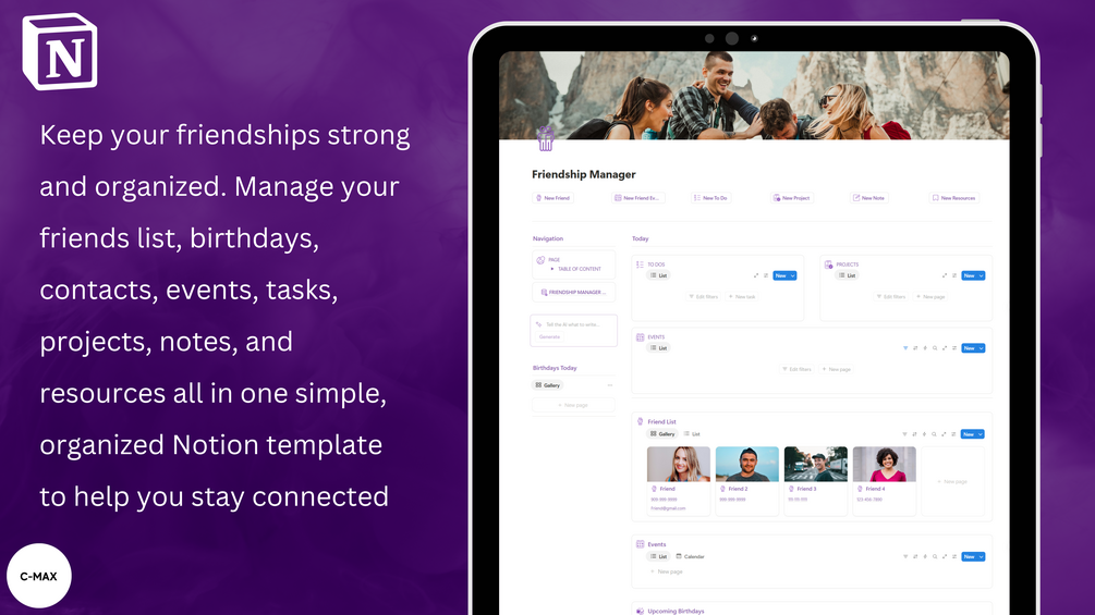Keep your friendships strong with this Friendship Manager! Track contact info, birthdays, hangouts, and notes about your favorite people. Stay intentional, connected, and never lose touch with those who matter.