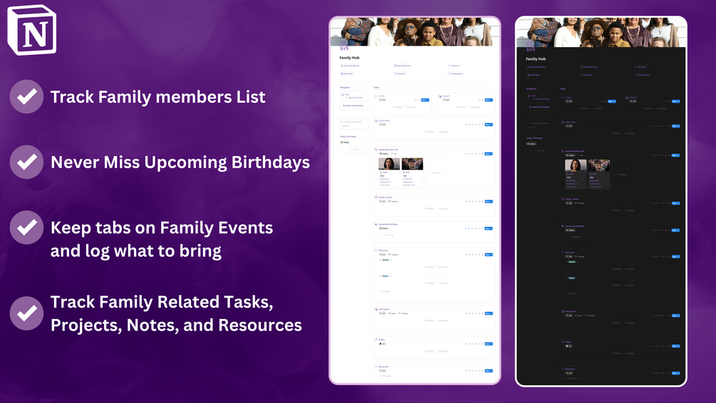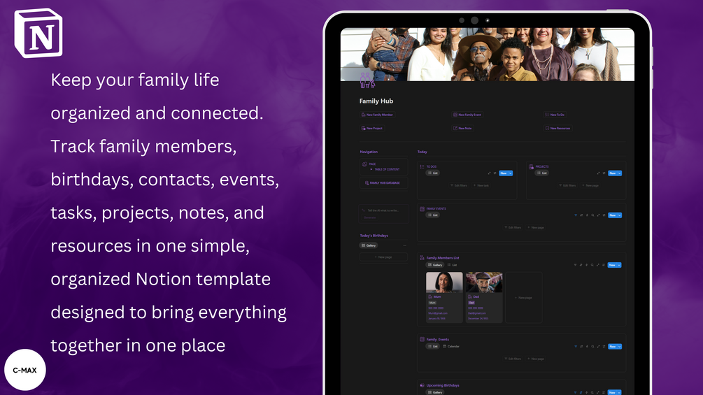 Stay connected with your loved ones using the Family Hub! This Notion template helps you manage contacts, birthdays, and special events in one organized space. Keep your family's information and memories close, always.