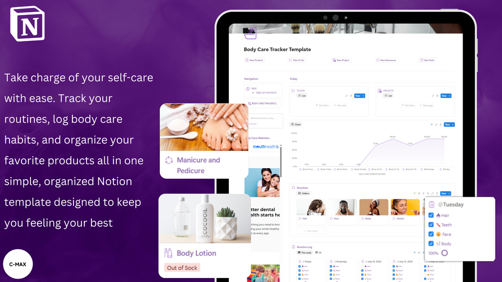 Keep your body care in check! This Notion template lets you track routines, build healthy habits, and manage the products you use. Perfect for skincare, haircare, and self-care enthusiasts who want to stay consistent and organized.