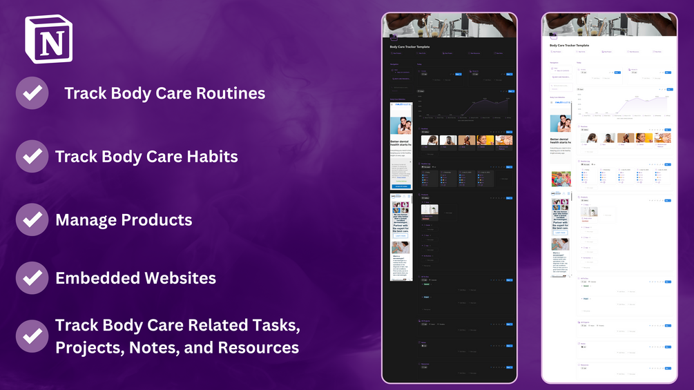 - A full Body Care Routine Database for managing your skincare, haircare, and hygiene habits.